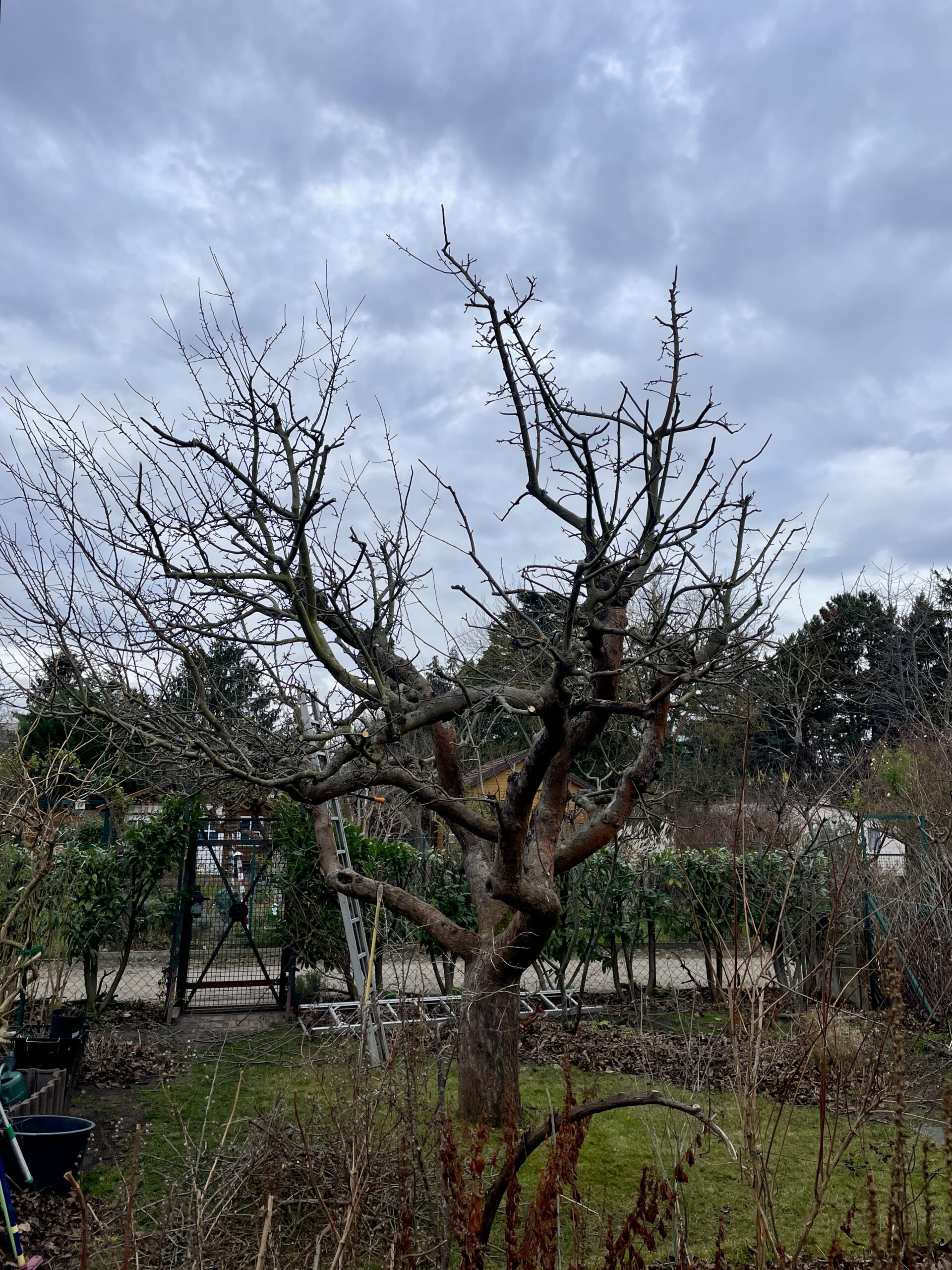 Beim Schnitt eines Altbaumes liegt der Fokus auf einer guten Mischung aus statischer Balance sowie dem Erhalt und der Förderung des Fruchtholzes. So entsteht eine Krone, die das Gewicht der entstehenden Ernte gut tragen kann und gleichzeitig leicht zu beernten ist.